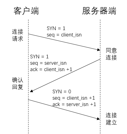 1. 客户端:我想建立连接,希望你准备好(SYN),我的序号为 client_isn