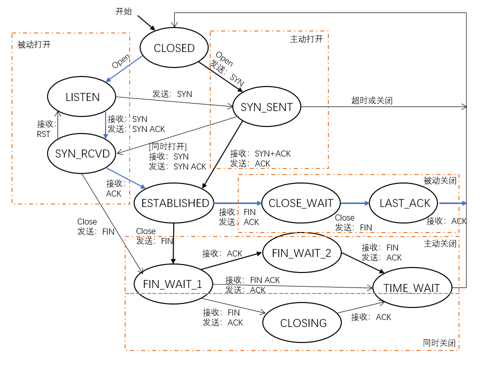 上图中粗黑线代表典型的客户端状态转移,蓝线代表典型的服务器状态转移。从中可以找到连接建立和关闭的状态转换。