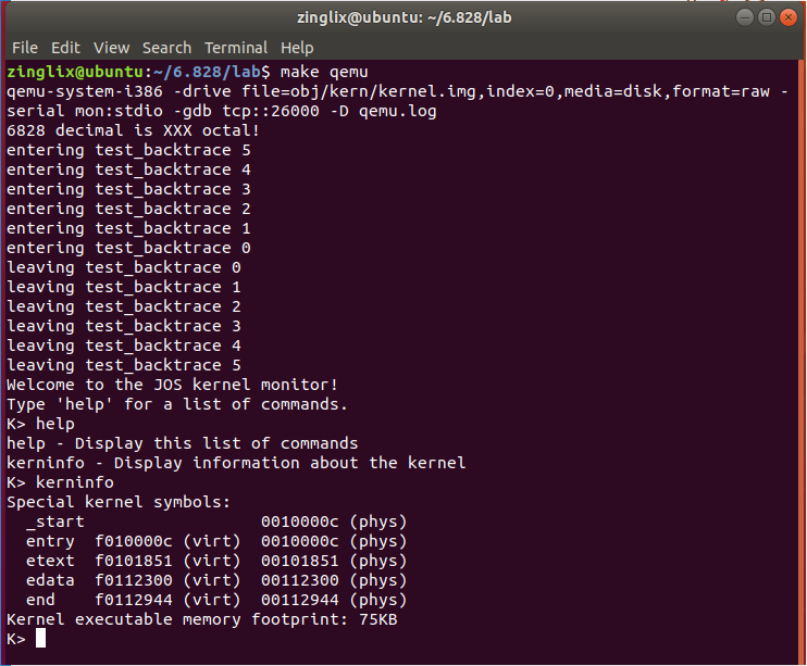 这一部分是为了引入 x86 汇编语言和了解 PC 的启动过程。相比较于直接运行在真机上,整个 Lab 都选择在一个叫 QEMU 的模拟器上进行。根据其指引编译,可以获得下图,代表编译成功。