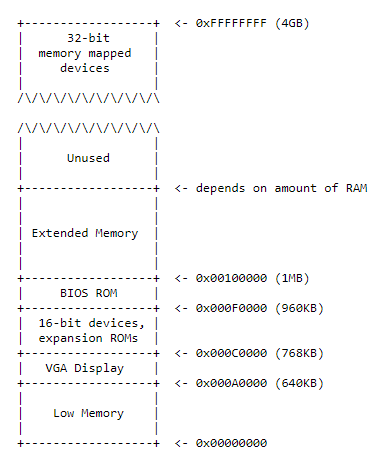随后的 CPU 对于内存大小的限制突破了 1MB,但是出于兼容性,0x0A0000 到 0x100000 这一范围仍被保留作为这些用途。