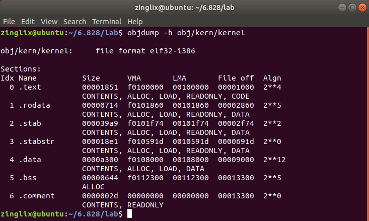之前查看 kernel 的 ELF 信息时可以发现 VMA 为 0xf0100000,这里用到了虚拟地址的技术,将其映射到了 0x0010000 的位置。
