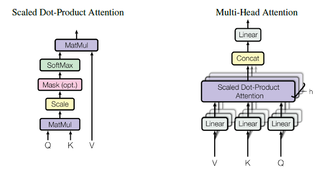 \[Attention(Q,K,V) = softmax(\frac{QK^T}{\sqrt{d_k}})V\]实际做的时候多除以了一个 \(\sqrt{d_K}\),按照的作者的说法是因为 \(QK^T\) 的值会很大,如果直接进行 softmax 会导致梯度过小,所以用 \(\sqrt{d_K}\) 进行了一次缩放。