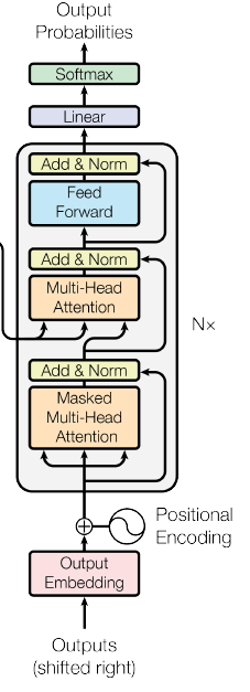 Decoder 部分同样为 6 层,并且有着与 encoder 相同输入,相同的多头注意力层和前馈网络层,相同的 Add&Norm,只是在其中又加了一层同时将 encoder stack 输出作为输入的注意力层。并且第一个注意力层变为 Masked 注意力层,将位于当前词之后的部分掩盖掉,以确保是从之前的句子内容中进行预测。在整个模型最后进行一次 Linear 变换和 softmax 就属于常规操作了。