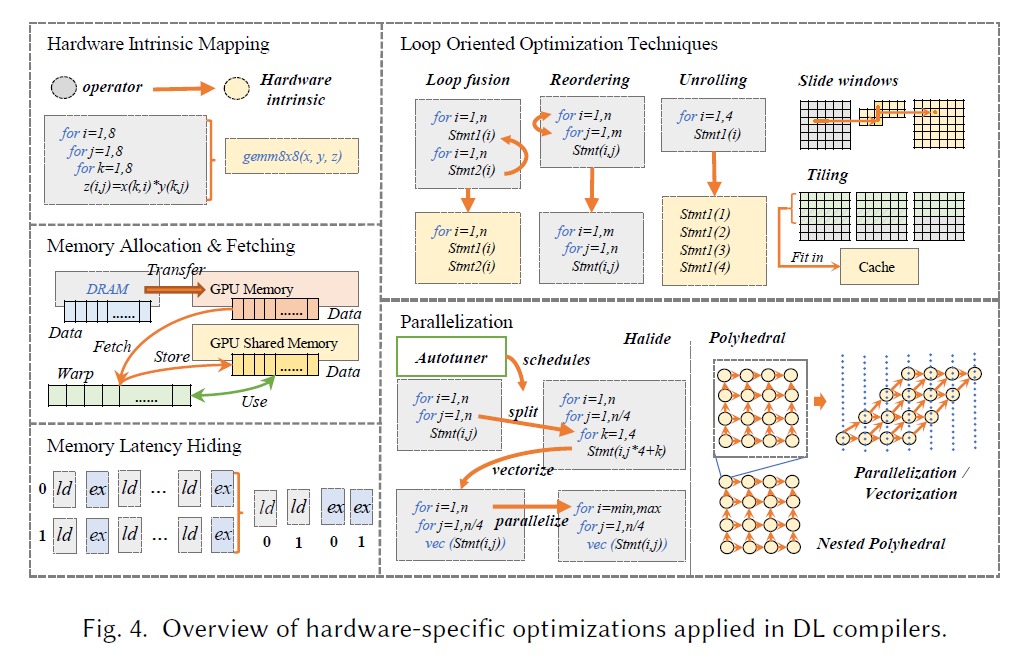 • Loop oriented optimizations:文中提到了 loop fusion(融合相同边界的循环), sliding windows(循环计算的变量仅在使用时计算,但会导致两个循环串行化), tiling(拆分循环为几部分,更好的利用局部性), loop reordering(修改循环内部代码顺序), and loop unrolling(展开循环再采用更多的优化方法)等方法优化循环。