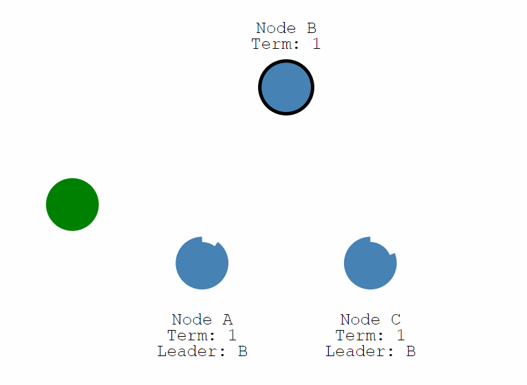 第一种情况是 Leader 下线,此时所有其他结点的计时器不会被重置,直到一个结点成为了 Candidate,和上述一样开始一轮新的选举选出一个新的 Leader。