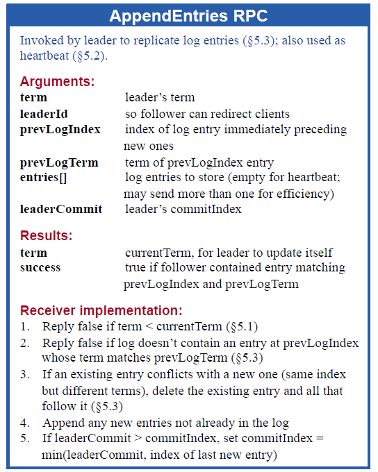 接下来我们就可以看到 Raft 实际中是如何做到日志同步的。这一过程由一个称为 AppendEntries 的 RPC 调用实现,Leader 会给每个 Follower 发送该 RPC 以追加日志,请求中除了当前任期 term、Leader 的 id 和已提交的日志 index,还有将要追加的日志列表(空则成为心跳包),前一个日志的 index 和 term。