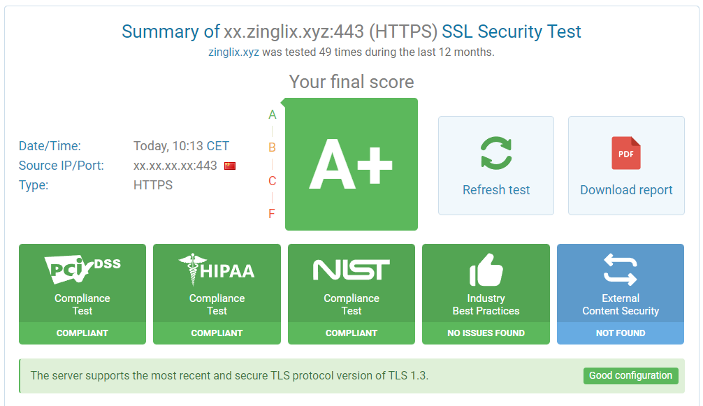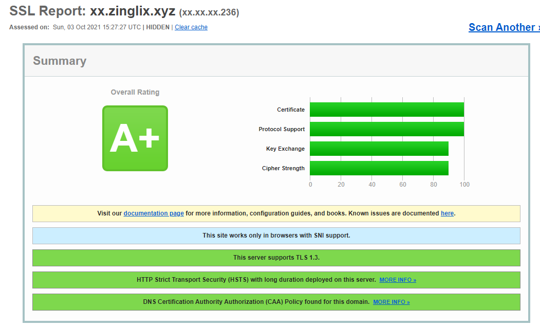 而 Cipher Strength,其要求所有加密套件均大于等于 256 bits,而这里存在一个 bug 是 TLSv1.3 有一个算法为 TLS13-AES-128-GCM-SHA256,虽然 128 位但其实配上 TLSv1.3 足够安全,但这导致了开启 TLSv1.3 就无法得到 100 分。